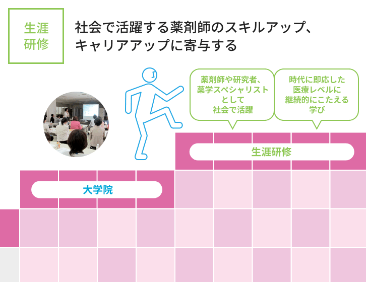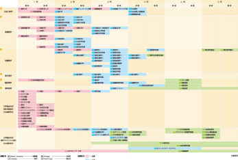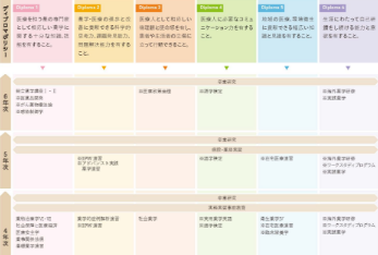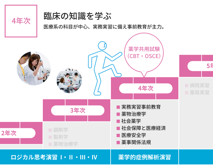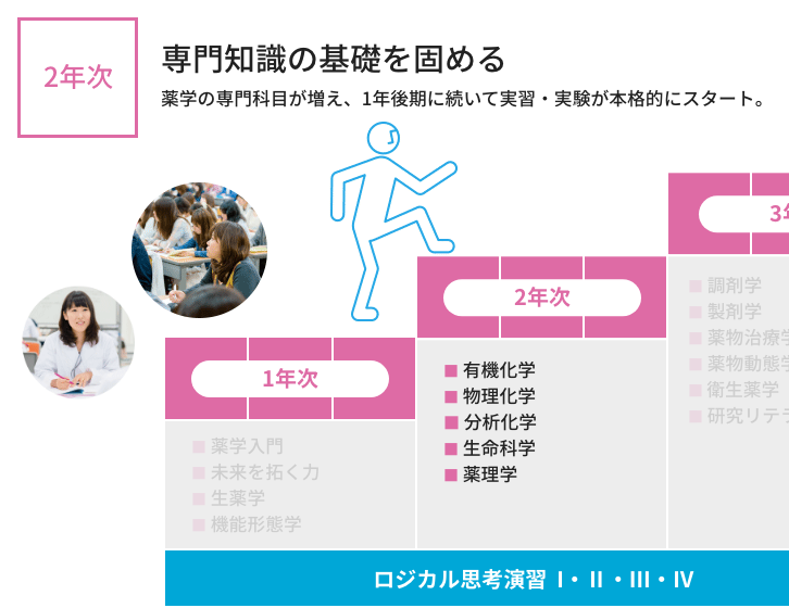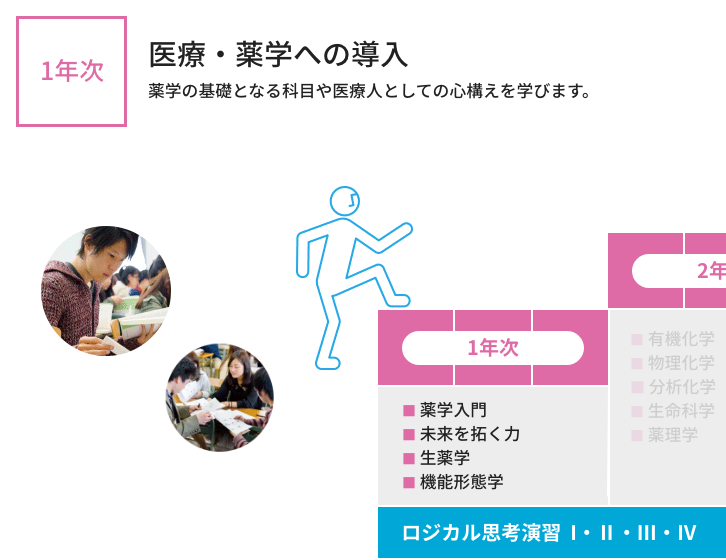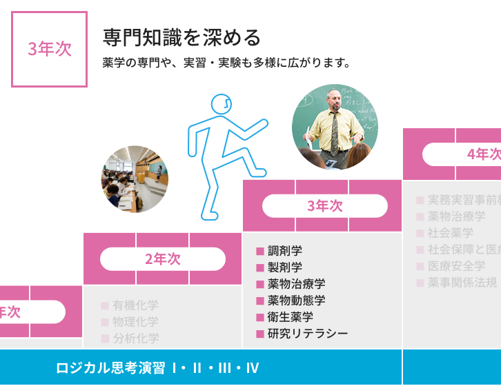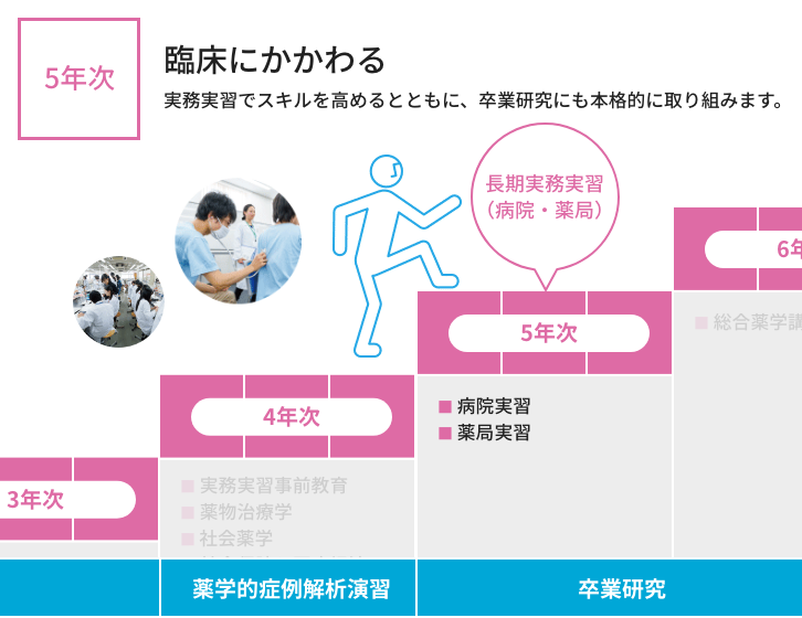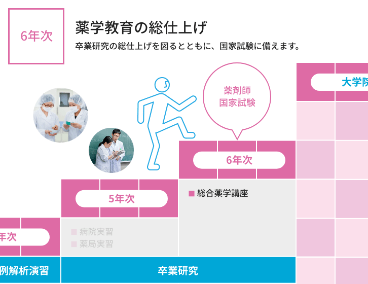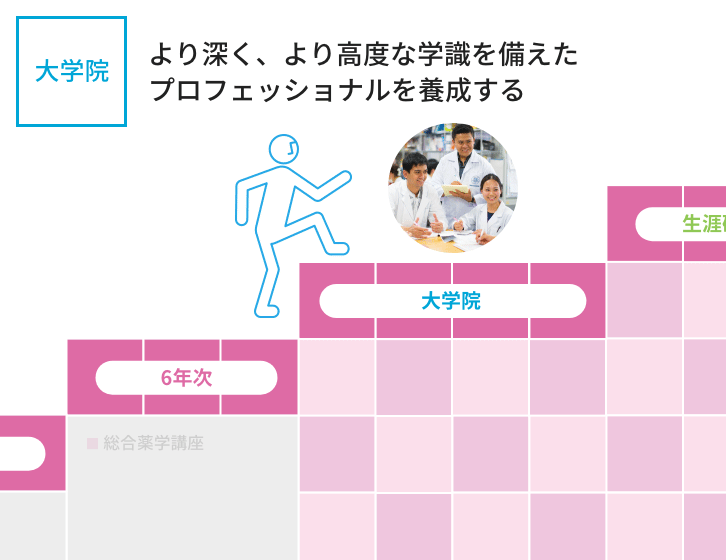 6年間の学び 本学では、初年次には薬学の基礎から医療人の心構えを学び、年次を重ねるにつれて専門性を高めていきます。 入学 1年次 2年次 3年次 4年次 5年次 6年次 大学院 生涯研修 ※代表的な科目名称を示しています。 ※開講科目の詳細はシラバスから確認してください。 開講科目はディプロマポリシーに従って、下図のように配置しています。 >カリキュラムマップ 開講科目は薬学教育モデル・コアカリキュラム(令和4年度改訂版)に下図のように対応しています。 カリキュラムツリー
